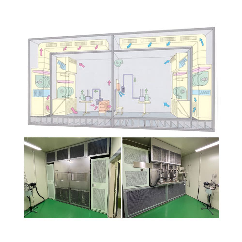 室内側は供試ルームエアコンに依り、冷却・除湿された分を加熱、加湿させJIS条件の温湿度条件に自動的に熱平衡させ、その維持に必要な供給量を測定する。室外側は供試エアコン凝縮器からの放熱分に見合った冷却除湿を自動的に熱平衡させ、その状態の熱総量を測定するという室内外共に上述の熱量計を備え、同時に測定できる装置です。