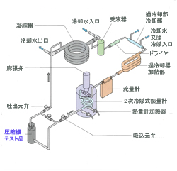| 2次冷媒熱量計法 | 蒸発器に2次冷媒式熱量計を使用した方式で、熱量計の加熱量からコンプレッサの冷凍能力を算出します。 |