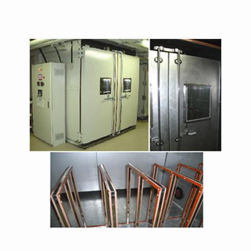 本試験装置は、試験槽内を2重構造としたダブルチャンバー方式と、湿度制御には飽和2流体混合方式を採用しています。それにより高温多湿(95℃、95%RH)の環境の実現を可能とし、温度を変化させても高湿度を一定に保持することができます。主に太陽電池モジュールの耐久試験・環境試験装置として用いられ以下の規格に準拠しています。