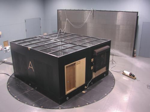 内部には実験対象空間(モデルハウス)と、風と角度を調節するためのターンテーブ
